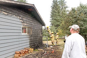 Chris Relien of 1313 Nevada looks on as firefighters Pete Crites, left, Nick Whiteman and Brent Wood make sure the fire is out. The fire started when a barbecue ember caught the grass on fire, which spread to the bushes and ignited the south side of the Relien garage Saturday afternoon.