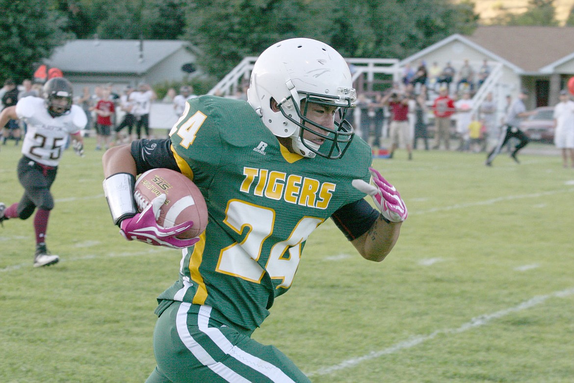 Andrew Managhan of the St. Regis Tigers sprints down the sideline for one of his touchdowns during last week's win against Alberton.