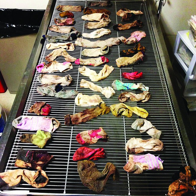 These socks were removed from the stomach of a Great Dane in Portland, Ore.