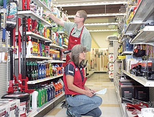 Ace Hardware employees Michelle Lamey and Aaron Smith take an inventory in the new section of the store formerly occupied by Hometown Variety.