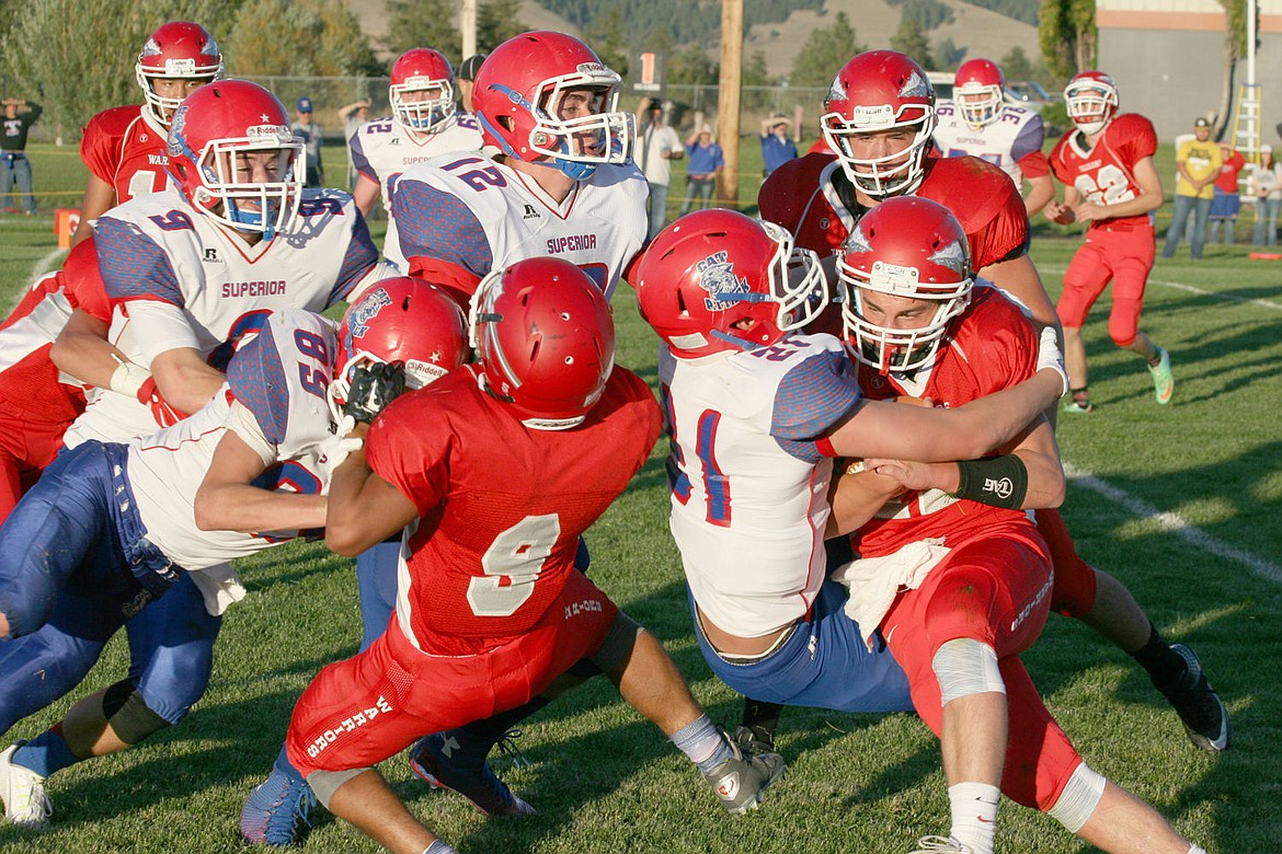 Seth West #89, left, drops an Arlee player while Josh Benda #21 wraps up another Warrior on the goal line during the Bobcat's season opener in Arlee last Friday.