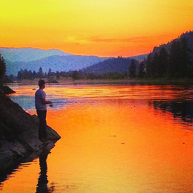 The sun ducks behind the mountains and lights up the Clark Fork River while Marcin Tomtas tries his luck with the smallmouth bass.