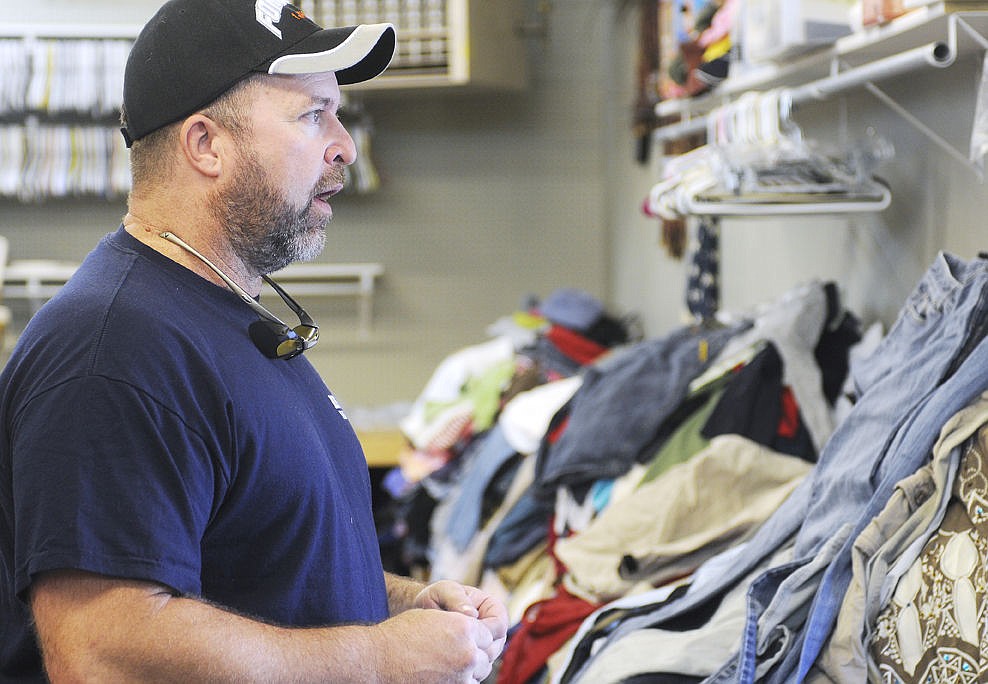 Allen Christopherson speaks with a customer about the Garden of Eden Thrift and Variety Store having to move because a liquor shop is moving into the location. (Aaric Bryan/d