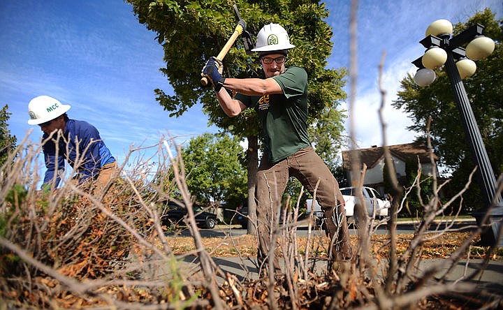 Tucker Culpepper, Montana Conservation Corps community outreach coordinator, and other volunteers help remove old shrubs near the Museum at Central School in Kalispell on Friday morning. The service project marked the 20th anniversary of AmeriCorps.