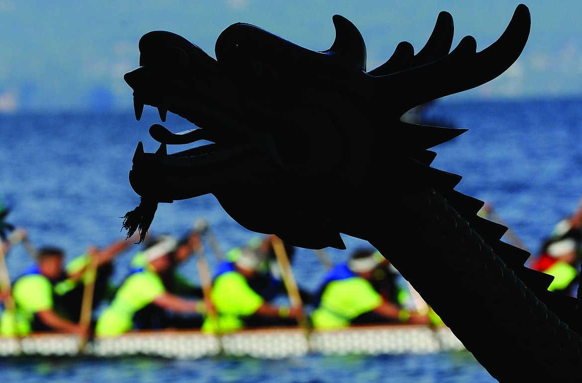 RACERS speed past a boat sitting ashore during the Montana Dragon Boat Festival at the Flathead Lake Lodge on Saturday. The third annual event featured 75 teams and is one of the 10 largest festivals in the nation.