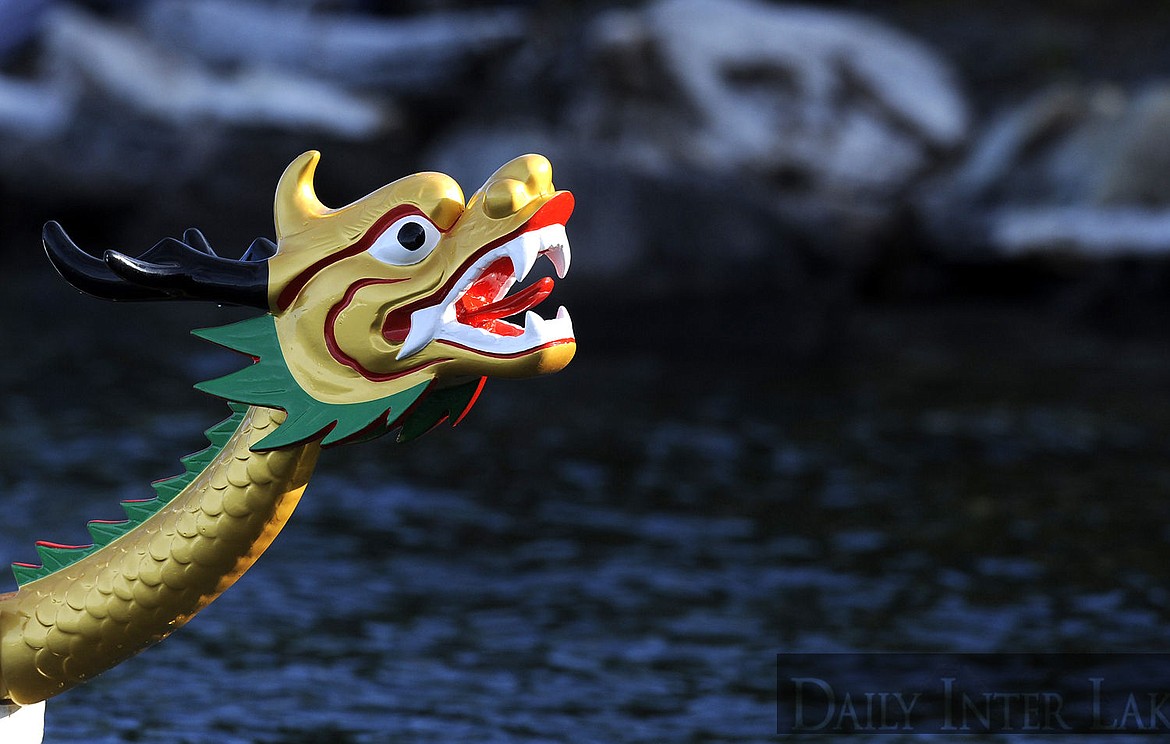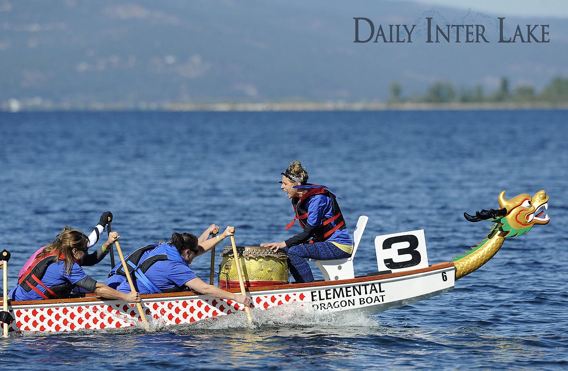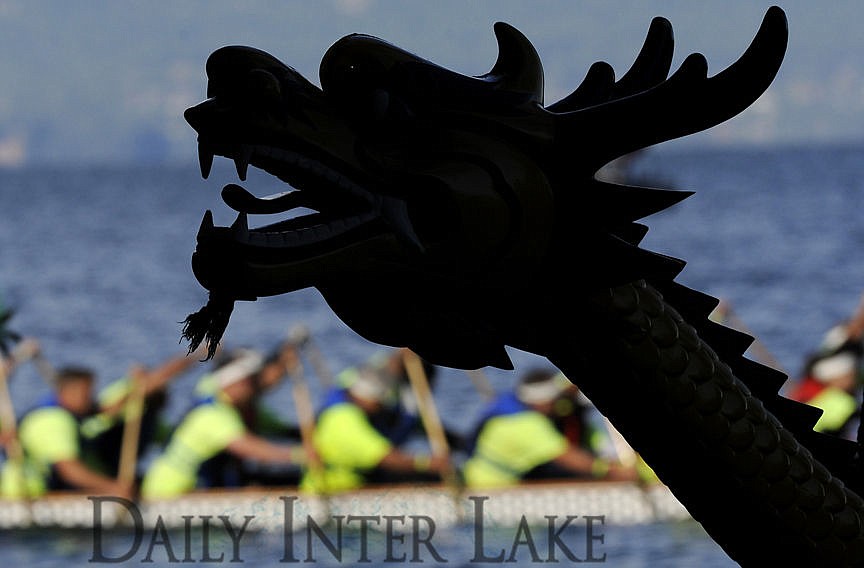 <p>Racers speed past a boat sitting ashore during the Montana Dragon Boat Festival at the Flathead Lake Lodge on Saturday. The third annual event featured 75 teams and is one of the 10 largest festivals in the nation. (Aaric Bryan/Daily Inter Lake)</p>