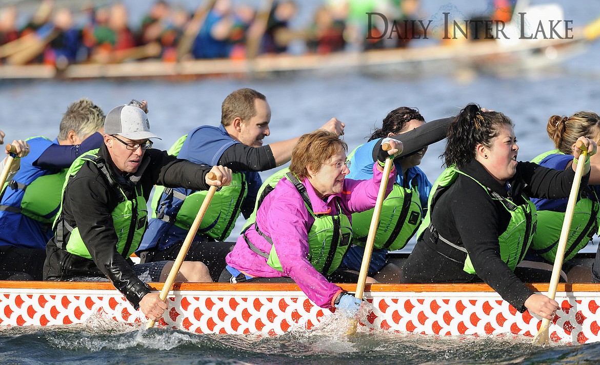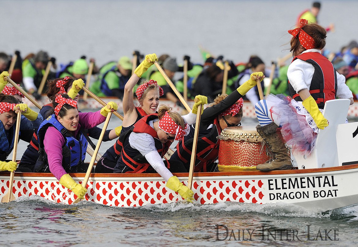 <p>The Riveting Rosies, a team of mothers from Kalispell and Columbia Falls, dig in as they paddle toward the finish line during their heat race Saturday morning at the Dragon Boat Festival on Flathead Lake.</p>