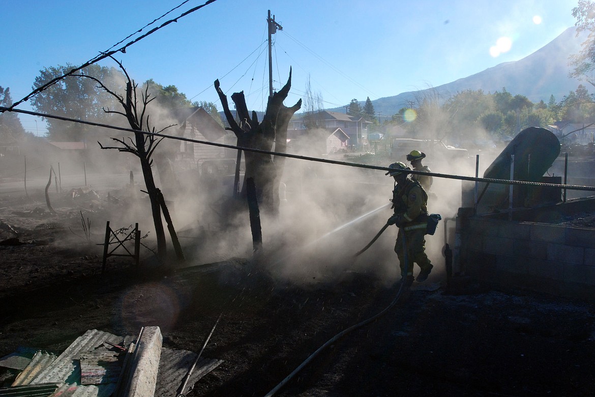 Firefighters hose down the smoldering remains of a home, Tuesday, Sept. 16, 2014, in Weed, Calif. A fast-moving wildfire destroyed at least 100 structures before winds died down and firefighters got a line around most of the fire. (AP Photo/Jeff Barnard)