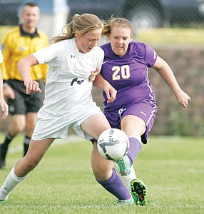 Shannon Reny and Laurel's Rylee Schultz compete for possession in second half Friday afternoon.