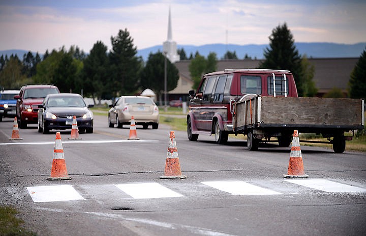 Traffic was delayed on Whitefish Stage Road on Tuesday, September 16, at evening rush due to crosswalk painting on the northbound side of the road. (Brenda Ahearn/Daily Inter Lake)