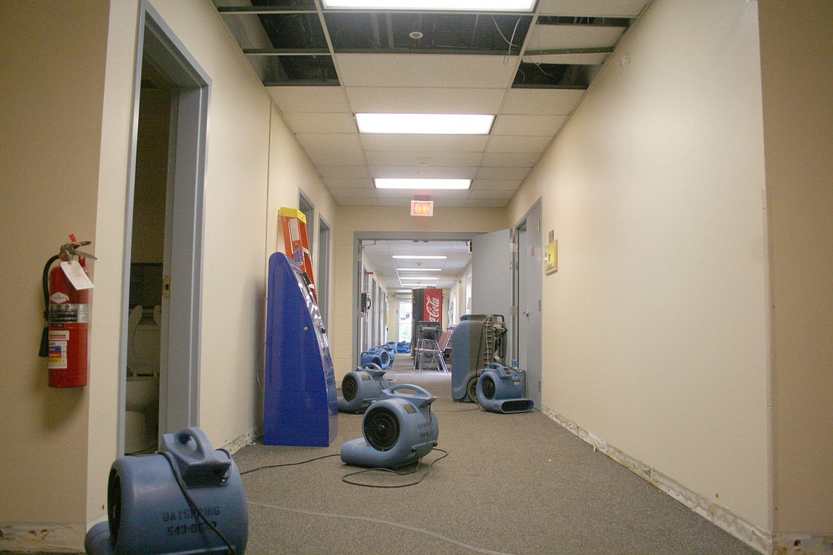 Fans and dehumidifiers dry out the Mineral County Courthouse after a water leak flooded the building.