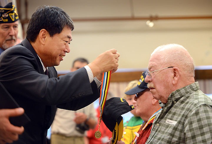 Moon Duk-ho presents a medal to Korean War veteran Neal Baker, U.S. Army, on Friday. There were 28 Veterans Home veterans honored: Ronald Anderson, Neal Baker, Halvdan Brosten, Braxton Brown, Russell Bucher, Donald Buffington, Theodore Chaffey, Charles Crawford, Donald Darling, Franklin Flanagan, John Giulio, Benjamin Grimm, Eugene Hamann, Eugene Holder, Archie Johnston, Glenn Koski, Robert Kriesch, Robert Letourneau, Mickey McHugo, Jacob Mitchell, Harry Mular, Donald Osbourne, James Pittman, Stephen Ployhar, Robert Rales, Herbert Rigoni, Clyde Stout, and Robert Walton. Deceased veterans James Elder, Paul Haag, James Luepkes and Roy Quimby also were honored. Their surviving spouses Jonelle Elder, Patricia Haag, Gail Luepkes and Joyce Quimby, who live at the Veterans Home, accepted the honors. (Brenda Ahearn/Daily Inter Lake)