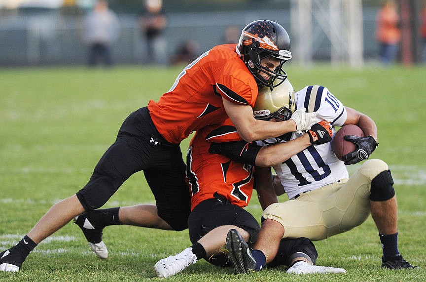 Braves Jess Beaman, left, and Jacob Link pull down Big Sky's Seamus Lucostic during the second quarter. (Aaric Bryan/Daily Inter Lake)