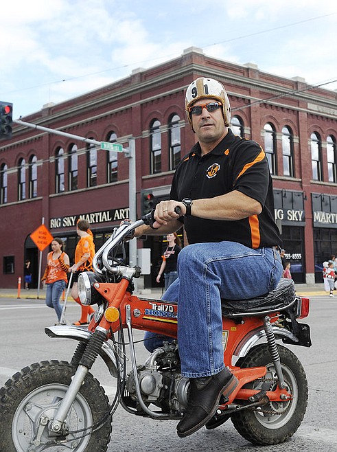 Flathead principal Peter Fusaro rides a mini bike during the high school's homecoming parade on Friday. (Aaric Bryan/Daily Inter Lake)