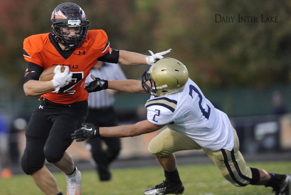 Flathead's Josh McCracken straight arms Big Sky's Josiah Gilberd during the Braves' homecoming football game at Legends Stadium on Friday, Sept. 19, 2014. (Aaric Bryan/Daily Inter Lake)