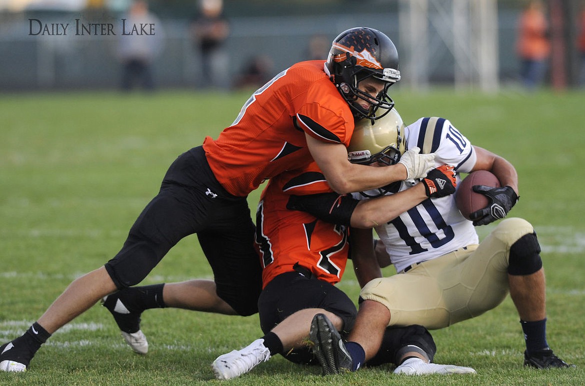 Braves Jess Beaman, left, and Jacob Link pull down Big Sky's Seamus Lucostic during the second quarter. (Aaric Bryan/Daily Inter Lake)