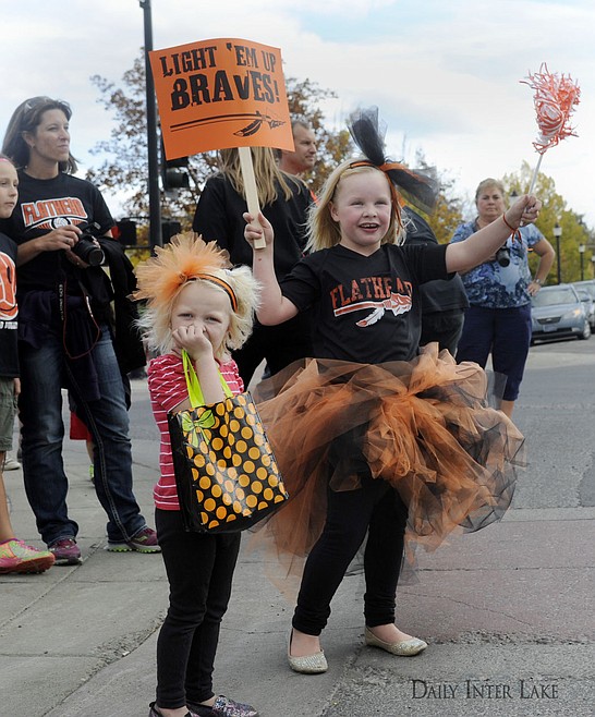 Molly, left, and Mallory Leigh cheer on the Flathead High School homecoming parade in Kalispell on Friday. (Aaric Bryan/Daily Inter Lake)