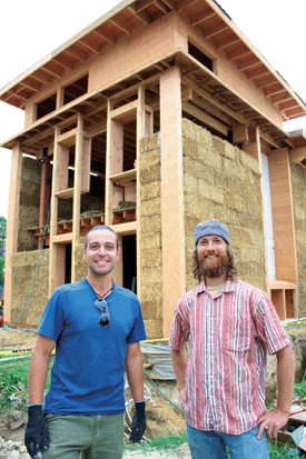 Around the corner, Jeff Shorman draws his trowel across a gray mass of lime plaster and, in one swooping motion, applies it directly onto the bales that make up another wall.
