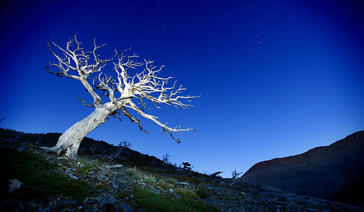A wind-gnarled tree, lit by a flashlight, along the Scenic Point Trail in Glacier National Park on Saturday evening, September 20. The trailhead is located 2.7 miles west of the Two Medicine entrance station. (Brenda Ahearn/Daily Inter Lake)