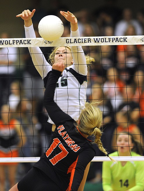 Glacier's Tessa Krueger blocks Flathead's Jessica Simmons shot at the net during the second game of the Wolfpack's 3-0 victory. (Aaric Bryan/Daily Inter Lake)