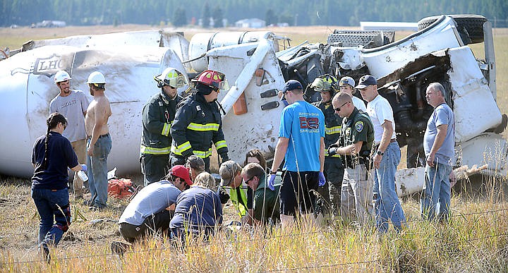 First responders work to help the driver of an LHC cement truck that went off West Reserve Drive and rolled over into a field on Tuesday afternoon west of Kalispell.