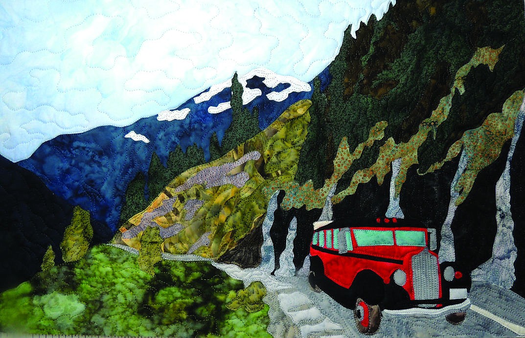 Her landscape quilts are works of art, with complicated threading creating familiar sights such as a red jammer bus making its way past Glacier National Park’s Weeping Wall.