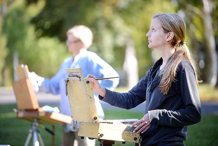 Erin VanDerMolen of Whitefish works on an oil painting in Woodland Park on Wednesday morning, September 24 as part of the Hockaday Museum of Art's From Field Study to Studio Painting, an oil painting workshop with artist Rob Akey of Whitefish. In the background is Marti Okerberg, also of Whitefish. "There is a reason a paint brush is as long as it is," said Akey. "You give up some control when you hold the brush at the end, and that is a good thing. It forces you be more creative, to give up the precise details we have been trained to focus on since we were in kindergarten and paint instead in large color notes." Wednesday was day one of a three day workshop. (Brenda Ahearn/Daily Inter Lake)