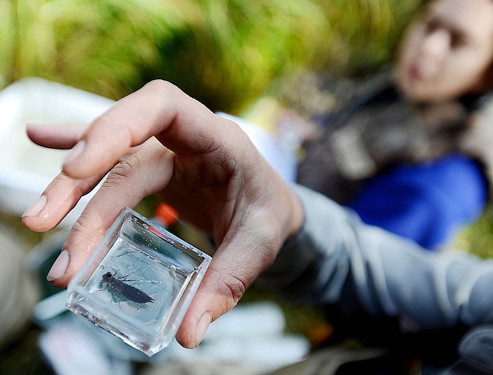Citizen Science Coordinator Jami Belt of the Glacier National Park, Crown of the Continent Research Learning Center displays a 15 millimeter dragon fly larvae on Wednesday, September 17, in Glacier National Park. The larvae were being collected to observe the amount of methyl mercury they contain. (Brenda Ahearn/Daily Inter Lake)
