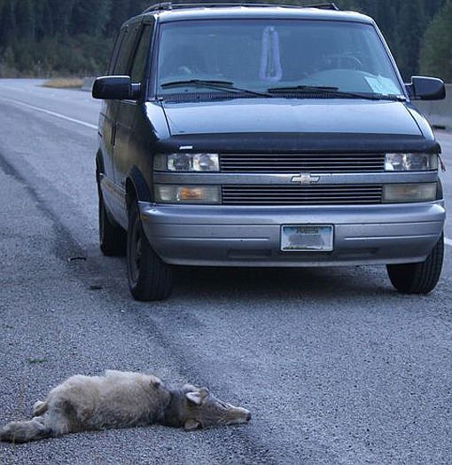“There was no time to hit the brakes (like I really would?) and I heard two distinct loud ‘thumps,’” he said. “Out of my mirror, I saw an almost black 50-pound wolf spinning around in the middle of the highway ... with one very apparent, very badly broken back leg. In the other mirror, I saw one slightly smaller wolf rolling onto the shoulder.”
