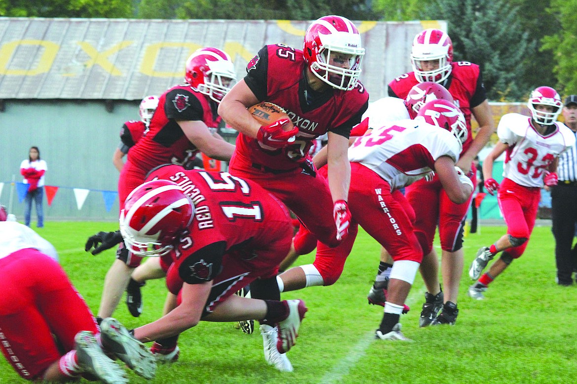 Senior running back Gary Wadman makes his way through traffic last Friday against Arlee.