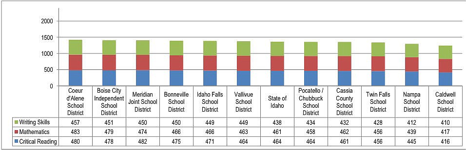 The average overall score in the Lakeland Joint School District was 1,434, Coeur d'Alene 1,420 and Post Falls 1,406.