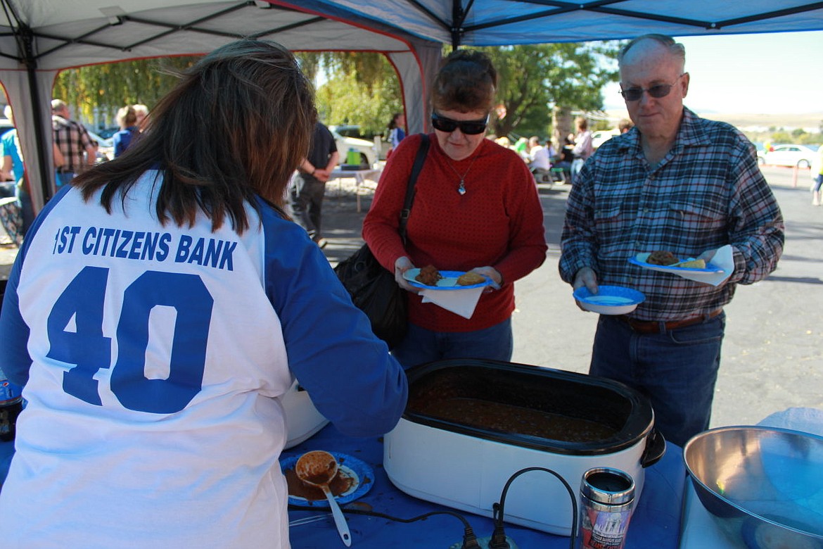 Above: Loan officer Debbie Denton, a 28-year employee of Citizen’s Bank, serves lunch to Wanda and Roger Wendt, of Polson, Saturday during the bank’s 40th Grand Opening anniversary barbecue Saturday. The Wendts are charter member of the bank. “I stood in line and got a T-bone steak for opening a checking account,” Wanda said.