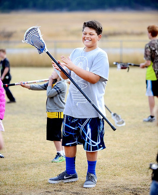 Trey Stevens, an eighth grader at Kila School cheers as helps younger students learn the basics of lacrosse at the Native American Heritage Day on Friday, September 26, in Kila. (Brenda Ahearn/Daily Inter Lake)