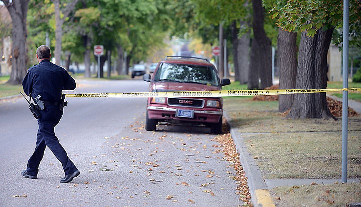 A Kalispell Police officer puts up restrictive tape across Third Avenue East on Monday morning in Kalispell. In spite of various "road closed" signs, motorists were still attempting to drive through the restricted area. (Brenda Ahearn/Daily Inter Lake)