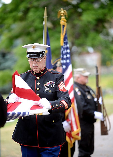 Sgt. Chuck Lewis, U.S. Marine Corps, of Ronan folds the American Flag at the Gold Star Mother's Day event at Brockman Park in Ronan on Sunday, September 28. (Brenda Ahearn/Daily Inter Lake)