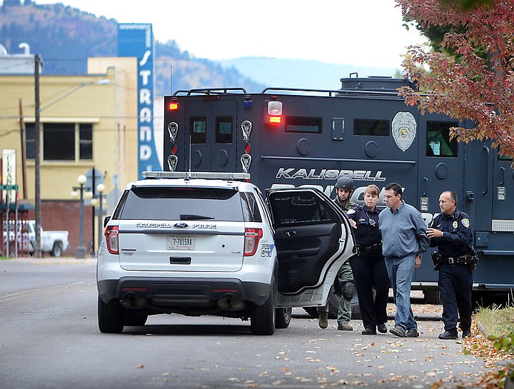 A man is taken into police custody on Monday morning on Second Street East in Kalispell. According to a press release from Kalispell Police Chief Roger Nasset, "After more than 2 1/2 hours of negotiating, the subject agreed to come out at 9:35 a.m. He was taken into custody for a mental-health evaluation. There were no injuries as a result of this incident and at this point it does not appear there will be criminal charges." (Brenda Ahearn/Daily Inter Lake)