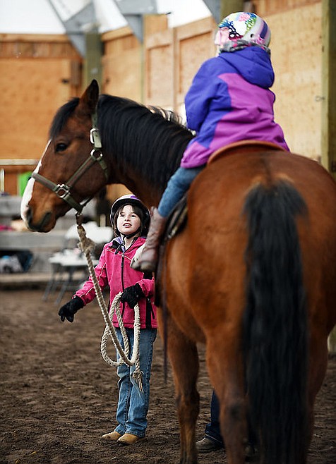 Royanne Wiedenmeyer, 7, of Kalispell looks up at the horse she is leading, as Italia Paulus, 8, of Columbia Falls takes her turn riding at the Tenderfoot Round up! Spring Break Horse Education 101 at Montana Horse Works in Columbia Falls on Wednesday, April 1. (Brenda Ahearn/Daily Inter Lake)