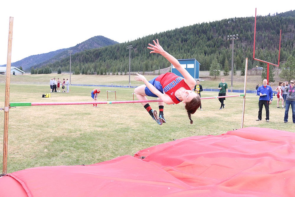 Marissa Koke flies over the bar during the high jump event at last week's meet in Superior.