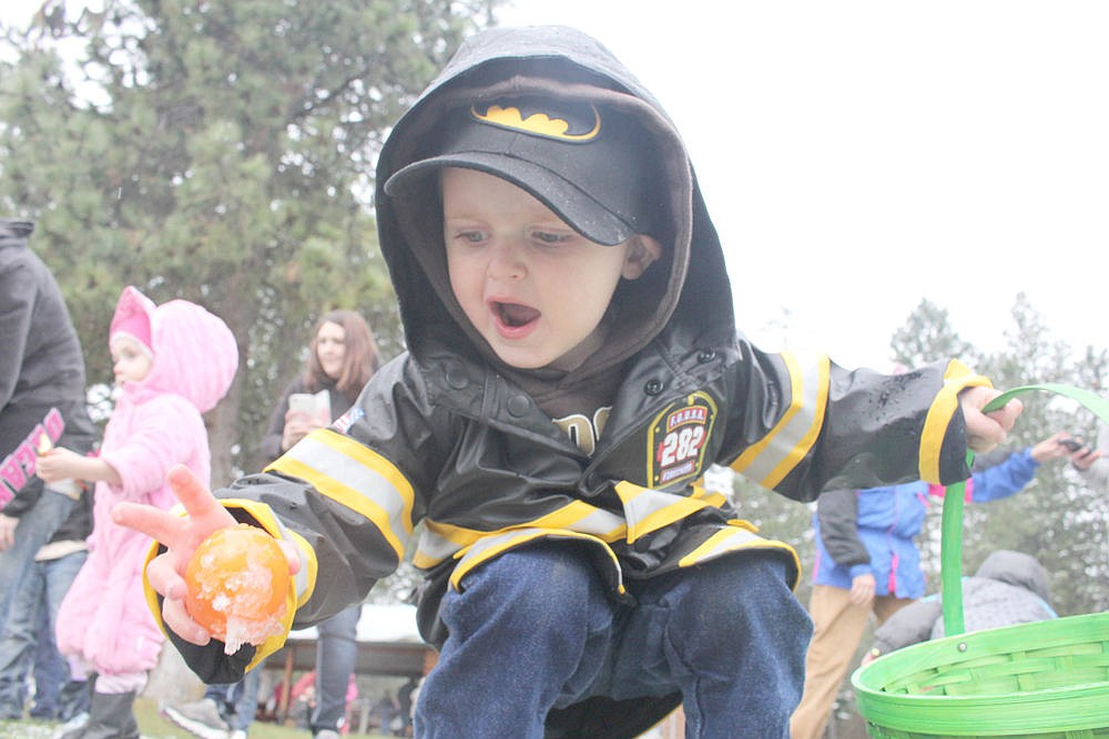 Rhett Baldwin brushes the snow off an egg during the St. Regis Easter egg hunt.