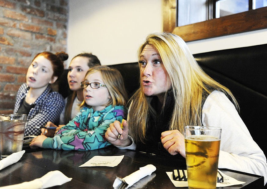 Christina Nadeau reacts to knowing an answer while playing trivia with Dylan Schmidt, from left, Josie Spoklie and her daughter Paige Nadeau at the Flathead Lake Brewing Co. in Bigfork on Wednesday, March 25, 2015. (Aaric Bryan/Daily Inter Lake)