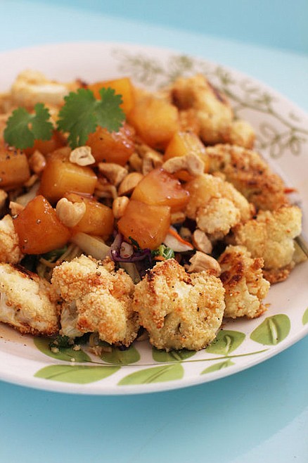 Instead, I created a flavorful and crunchy almond coating for roasted cauliflower. The florets get dunked in egg whites, then the almond mixture, then are roasted. When the florets come out of the oven, you can either toss them in the sauce, or just drizzle it over them. Add some cashews and you won't miss your take-out.