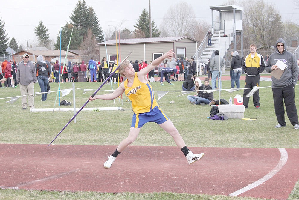 Kade VanElswyk of Thompson Falls throws a javelin during the Jim Johnson Invitational in Missoula. VanElswyk would finish fourth in the javelin with a throw of 142-2.