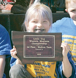 Brooke Yeadon proudly displays the Little Guy Western Montana Championship First Place plaque Thursday afternoon at Libby High School.