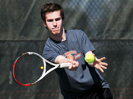 Flathead's Daniel Olszewski returns the serve of Glacier's Hunter Blalack at Flathead Valley Community College on Thursday. (Aaric Bryan/Daily Inter Lake)