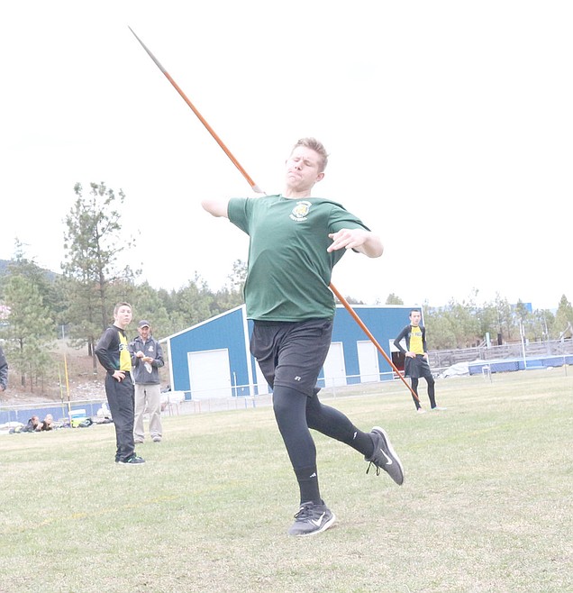 Gibson Lowry of St. Regis lets a javelin fly during the first track and field meet of the season in Superior.
