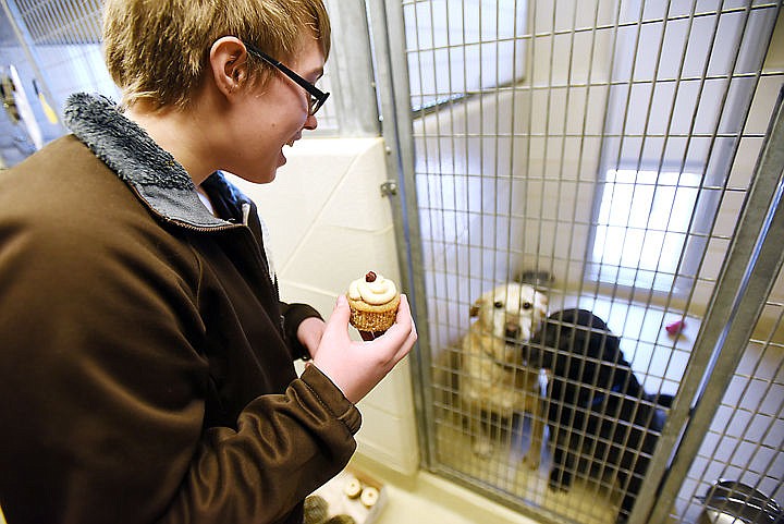 Ebony and Ivory, two dogs who were recently adopted, look up with anticipation at Sarah Baier as she delivers "pupcakes" to dogs at the Flathead County Animal Shelter on Wednesday, April 8. (Brenda Ahearn/Daily Inter Lake)
