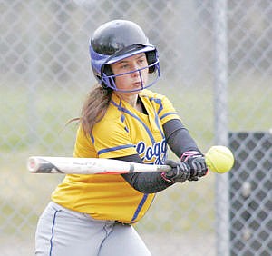 Madisen Monigold with a base hit bottom of first inning vs. Eureka. Lady Loggers prevail 13-5 in five innings, 4-11-15.