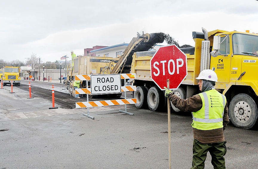 Traffic is stopped at the intersection of Second street west and First avenue west as a planer loads a truck on Tuesday. Workers from the Knife River Corporation are repaving First Avenue East and First Avenue West through the downtown area. The work is expected to last about two weeks. (Aaric Bryan/Daily Inter Lake)