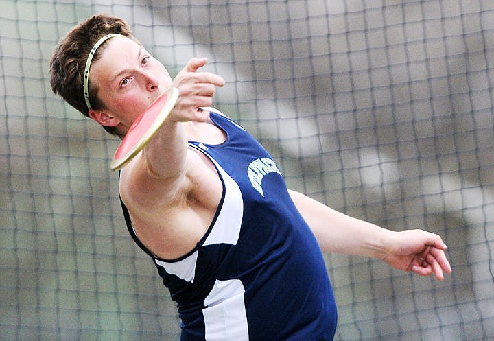 Glacier's Harrison Kauffman heaves the discus 142 feet and 4 inches in the crosstown dual at Legends Stadium on Tuesday. (Aaric Bryan/Daily Inter Lake)
