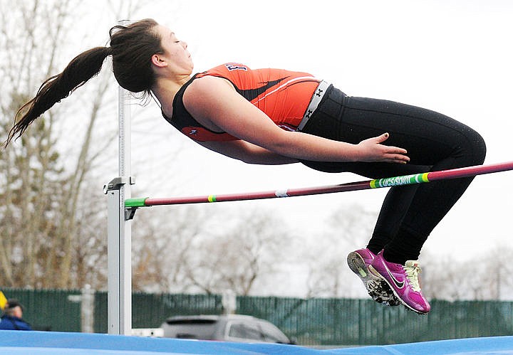 Flathead's Liz Sherwood clears the bar set at 4 feet, 6 inches during a jump-off to win the high jump. Sherwood had cleared 4 feet, 7 inches earlier. (Aaric Bryan/Daily Inter Lake)